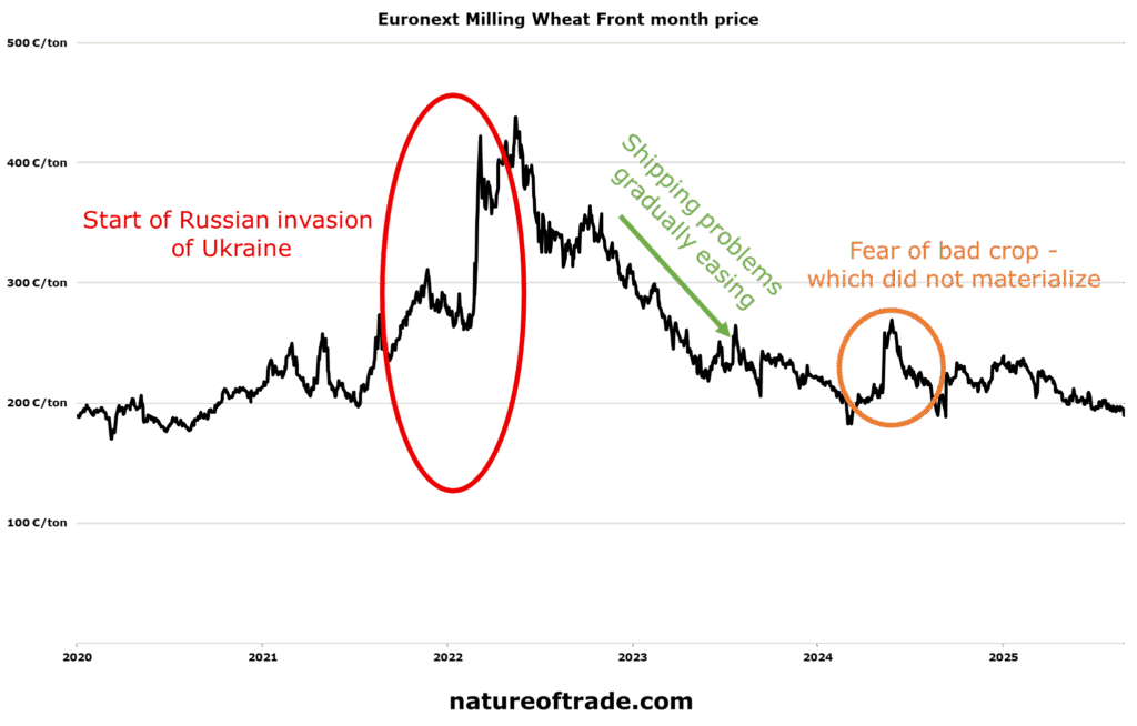 As of August 2025 the Euronext futures shows a mostly flat price curve. Mills and consumers may see inflation concerns ease (though the price of wheat has only minimal impact on end product prices), but producers are far from happy. The same price as 5 years ago with input costs rising is never a good omen.