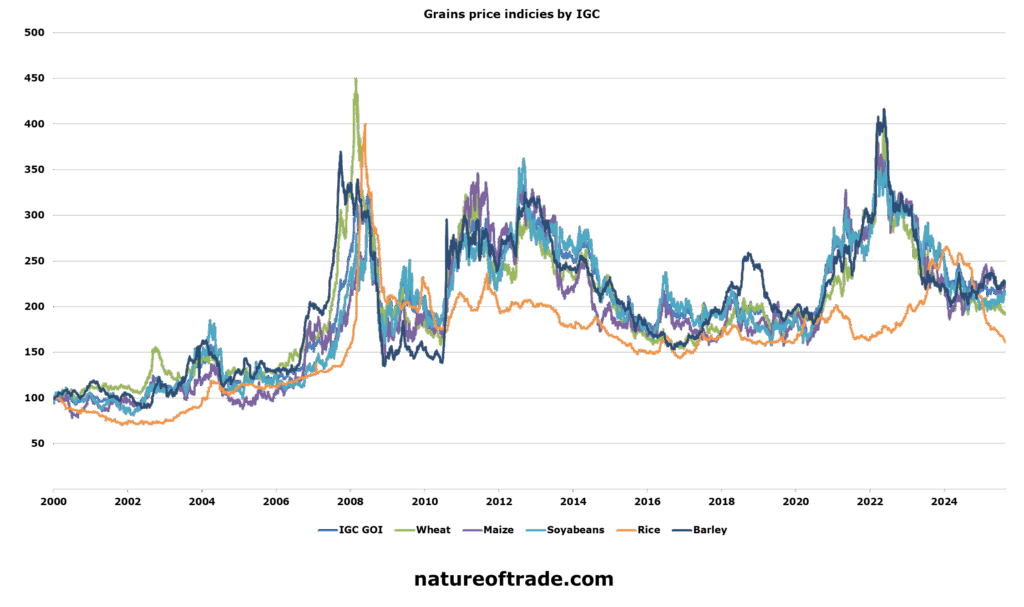 The IGC has a pretty informative index. Apart from rice, mot grain prices are highly correlated. Not sure what’s up with barley – it’s occasional differing price may be explained by volatility from demand? If you know the reason please do leave the solution in the comments.